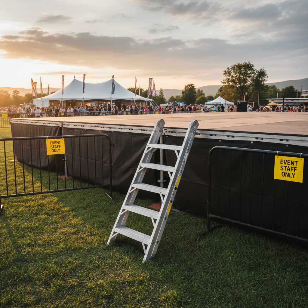 Escalera de 4 escalones para acceso a tarimas. Resistente y segura para cualquier tipo de evento.