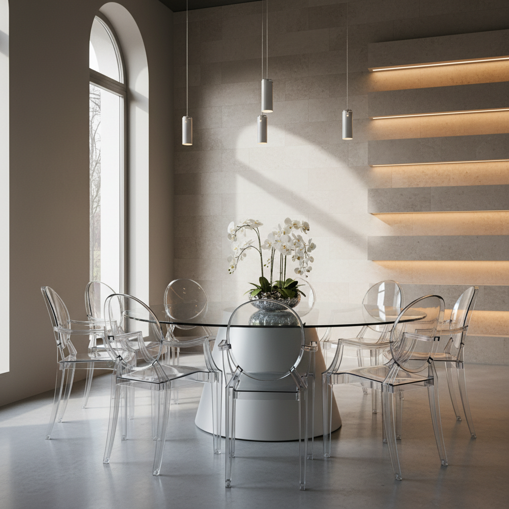 Silla Ghost de acrílico transparente. Diseño moderno y minimalista que se adapta a cualquier decoración.