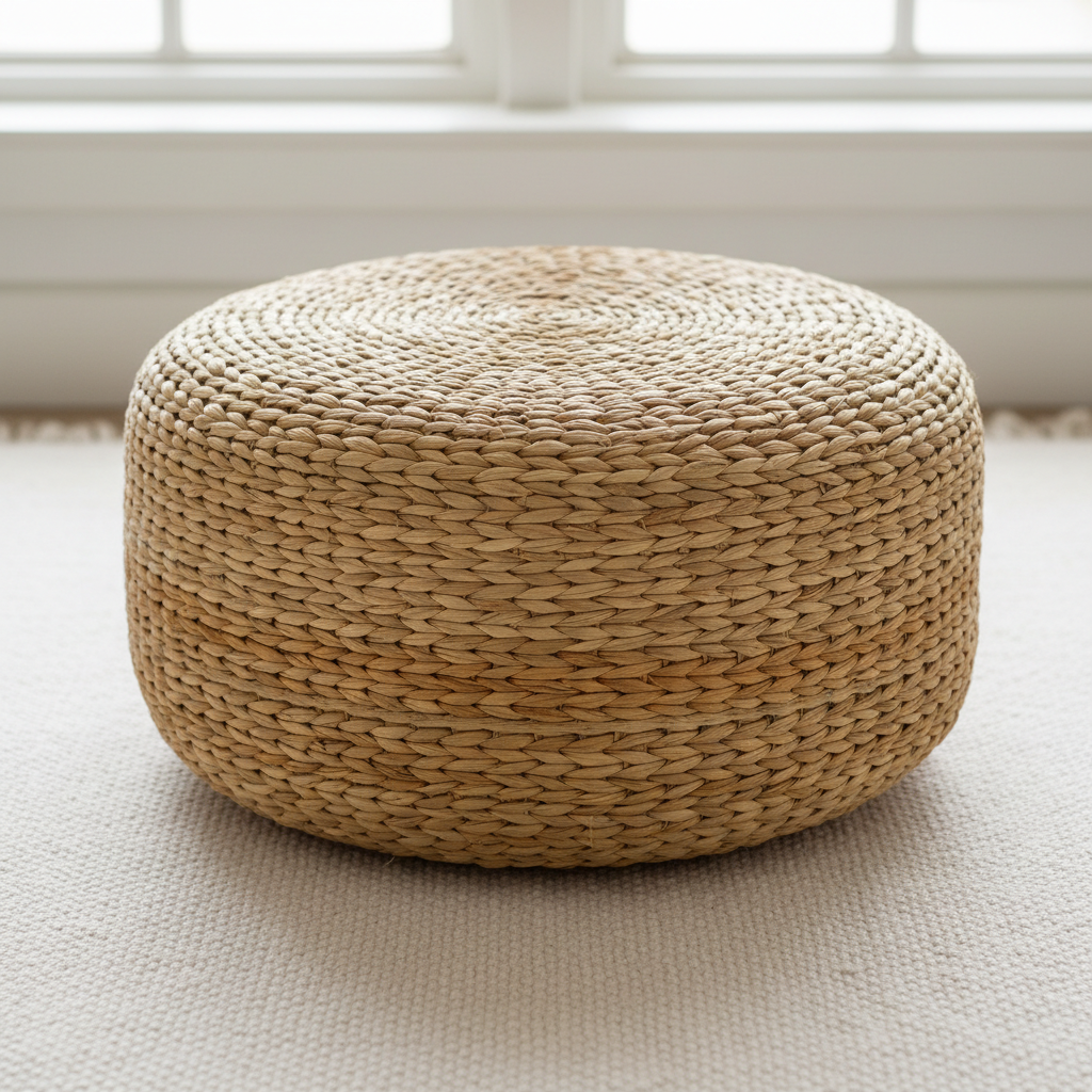 Puff de rafia en dos tonos, 50cm de diámetro. Ideal para zonas lounge y áreas de descanso en eventos.
