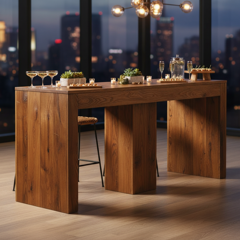 Mesa alta de madera con doble nivel. Elegante y funcional para recepciones y zonas de cóctel.