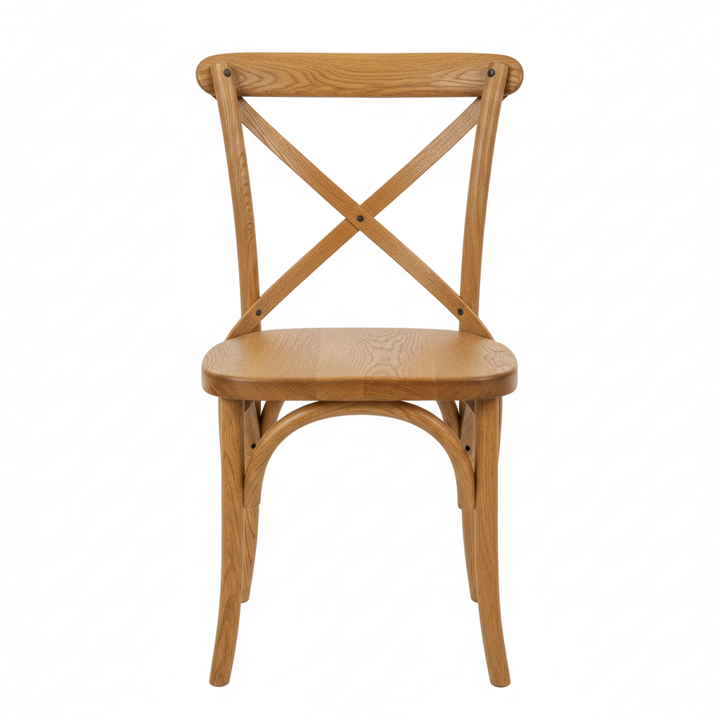 Silla crossback de madera natural con respaldo en X. Versátil y elegante para cualquier tipo de evento.