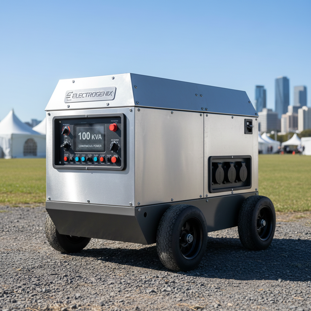 Generador de 100 KVA para suministro eléctrico continuo. Garantiza el funcionamiento de todos los equipos del evento.