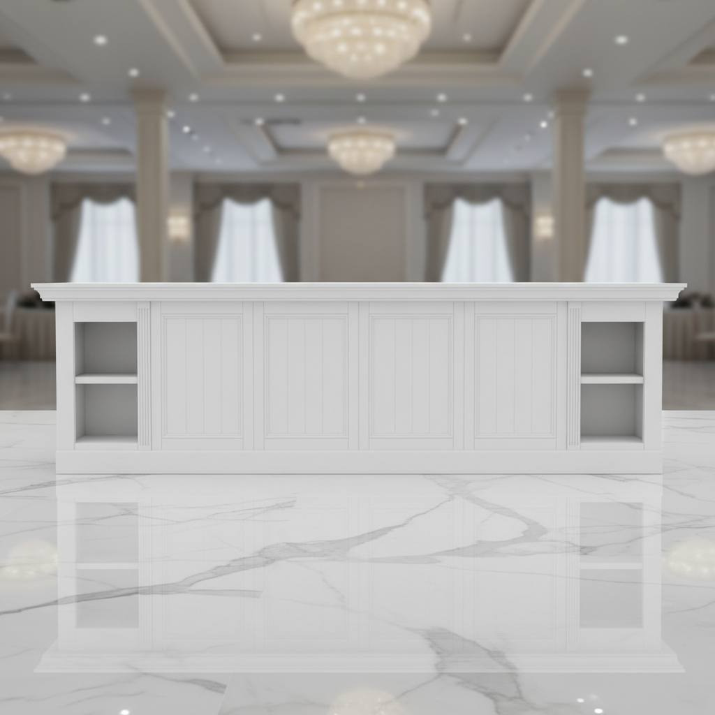 Bar de madera en color blanco, 95"x28"x44" de altura. Elegante y espacioso para recepciones y eventos de gala.